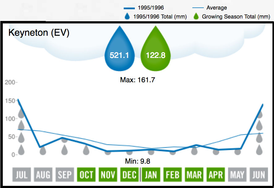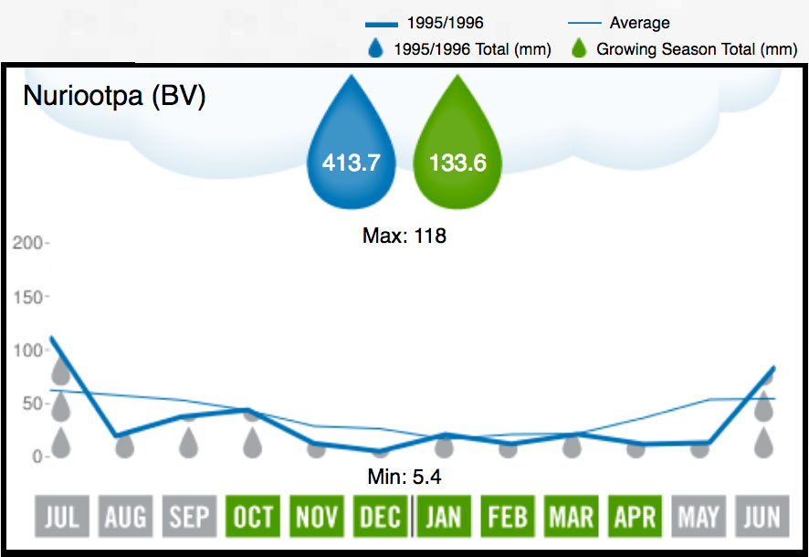 One of the strongest vintages in the 1990s, 1996 was a season of below average rainfall and above average temperature. Summer was dry and hot leading to some leaf loss, stress and sunburn on Riesling and Sauvignon Blanc. Cool wet conditions in early March caused some disease concerns, especially oidium. Nevertheless, yields were above average and the cool finish through April produced great Cabernet Sauvignon wines and excellent Shiraz, as well as strong whites.
