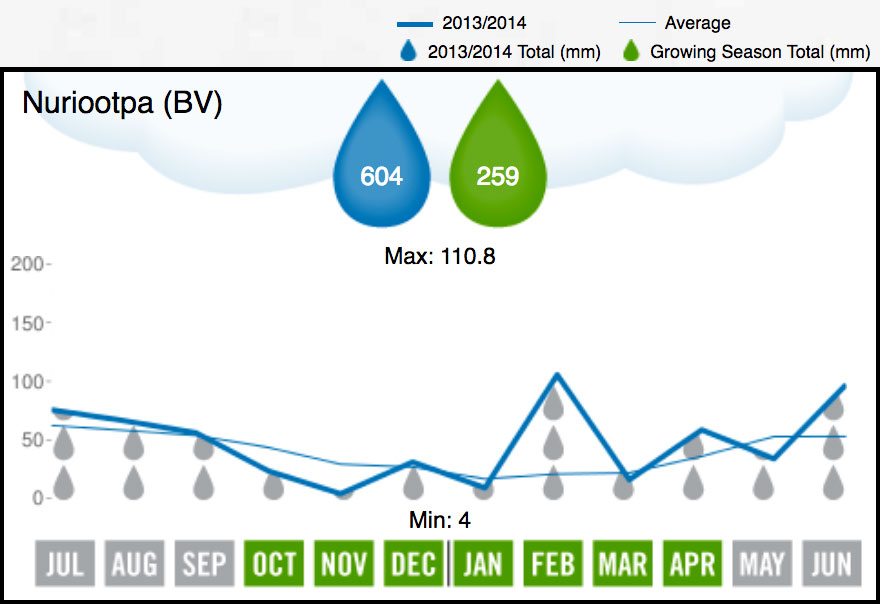 Really good winter and early spring rains filled the soils and set the vines up well for the season. July-Sept rainfall was 20% (36% EV) above average. A windy spring meant that some varieties set unevenly with potentially poor yields, and then in November with vines full-growth and with flowering underway, parts of the Barossa and Eden Valleys experienced unseasonal frost events resulting in almost complete loss of fruit for some vineyards.