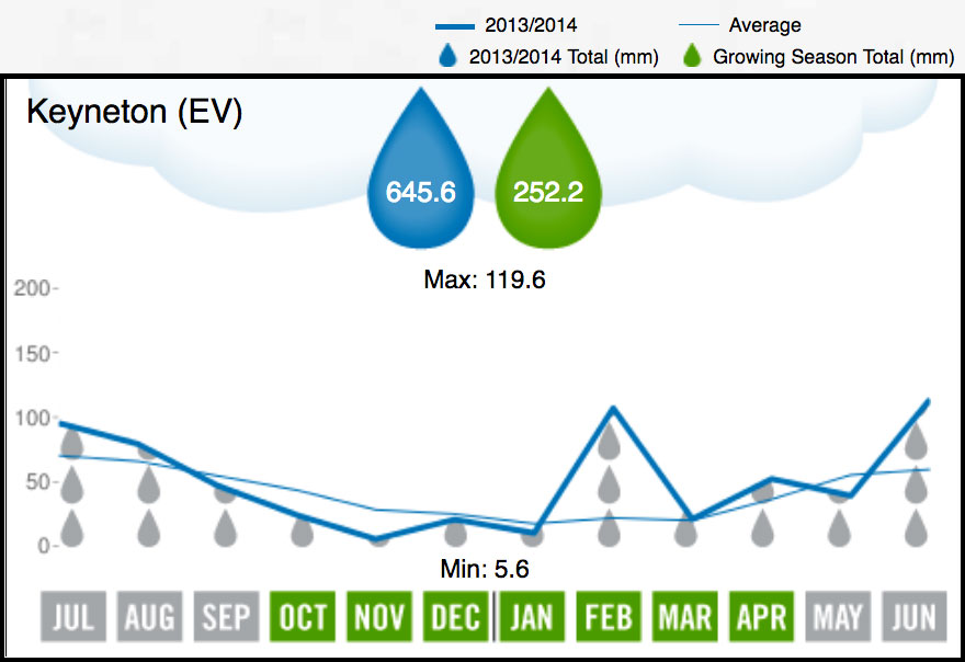Late spring and summer were dry and warm at least during the days, with significant heat records being set. September was over 2°C above both average minimum and maximum temperature and January’s maximum temperature was 2° warmer than average. After an average September rainfall, October had only 56% (EV 85%) and November 11% (EV 24%) of average rainfall. Along with the dry, November had particularly cold nights (2°C lower than average) leading to the multiple frost events mentioned above.